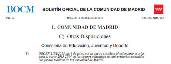 La Comunidad de Madrid ha publicado en el BOCM el Calendario 2013-2014 para el curso 2013-2014.