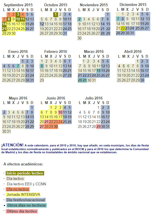 Orden 1486/2015, de 21 de mayo, de la Consejería de Educación, Juventud y Deporte, por la que se establece el Calendario Escolar para el curso 2015-2016 en los centros educativos no universitarios sostenidos con fondos públicos de la Comunidad de Madrid.