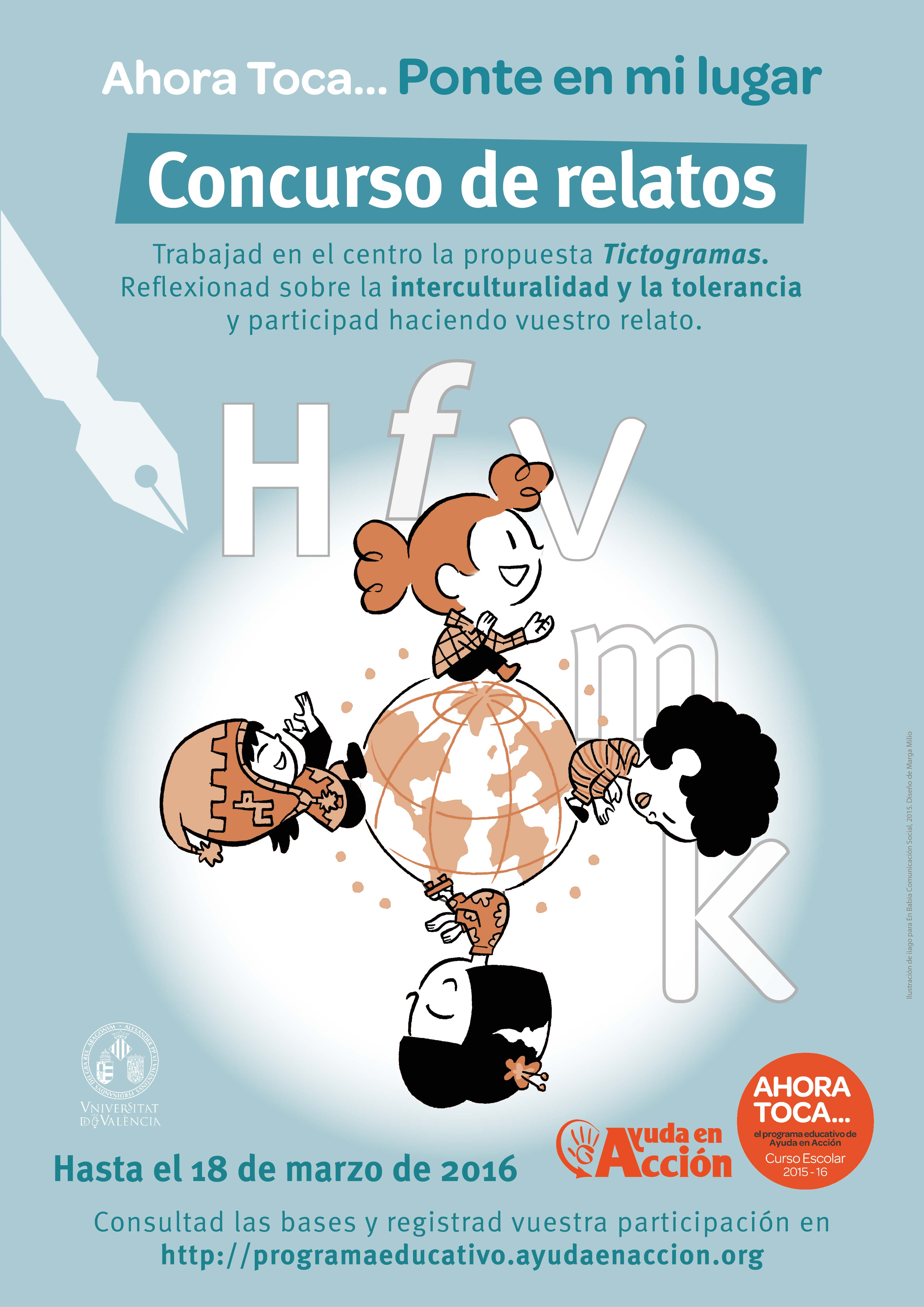 El III Concurso de Relatos Ahora Toca… Ponte en mi lugar, como ya lo hicieron sus antecesores, va un poquito más allá que el resto de certámenes escolares y propone un reto: trabajar los valores de la interculturalidad y la tolerancia, a partir de la propuesta Tictogramas en la que grandes y pequeños aprenderán sobre diversas culturas y realidades sociales en las que viven millones de niños y niñas en el mundo. Tomando lo mejor de cada cultura, entre todos y todas seremos capaces de crear una nueva sociedad más justa e igualitaria, que comparte un mismo planeta y lo preserva para futuras generaciones. #Tictorelatos