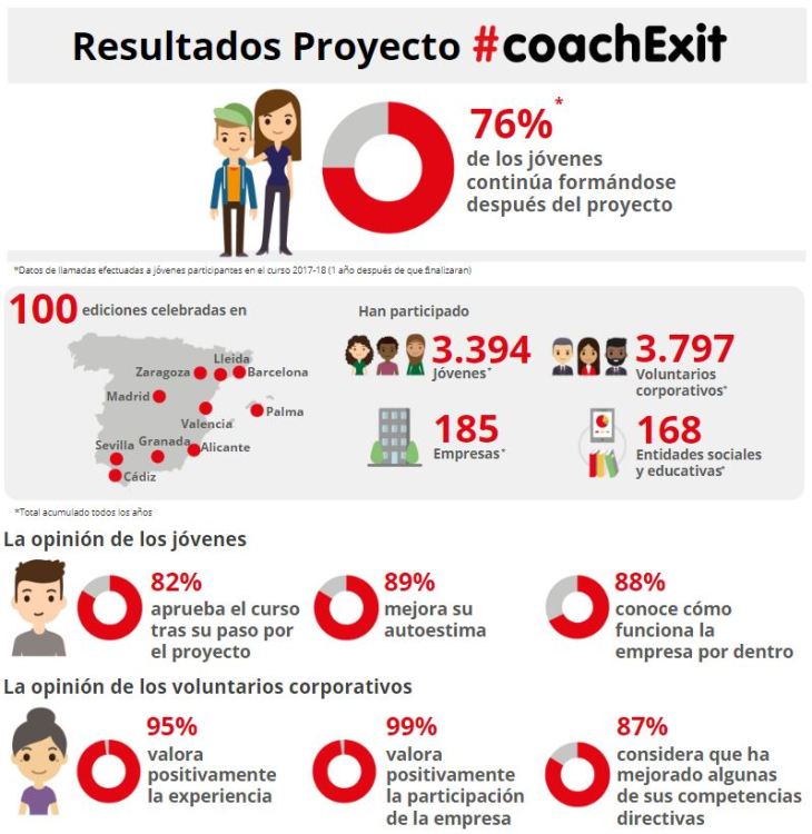«El Proyecto Coach Exit es una iniciativa de voluntariado corporativo que pretende orientar y motivar a jóvenes en situación de vulnerabilidad social que provienen de una experiencia de fracaso escolar a través del coaching y del mentoring.