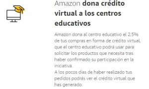 - Amazon dona al centro educativo el 2,5% de tus compras en forma de crédito virtual, que el centro educativo podrá usar para solicitar los productos que necesita tras haber confirmado su participación en la iniciativa.